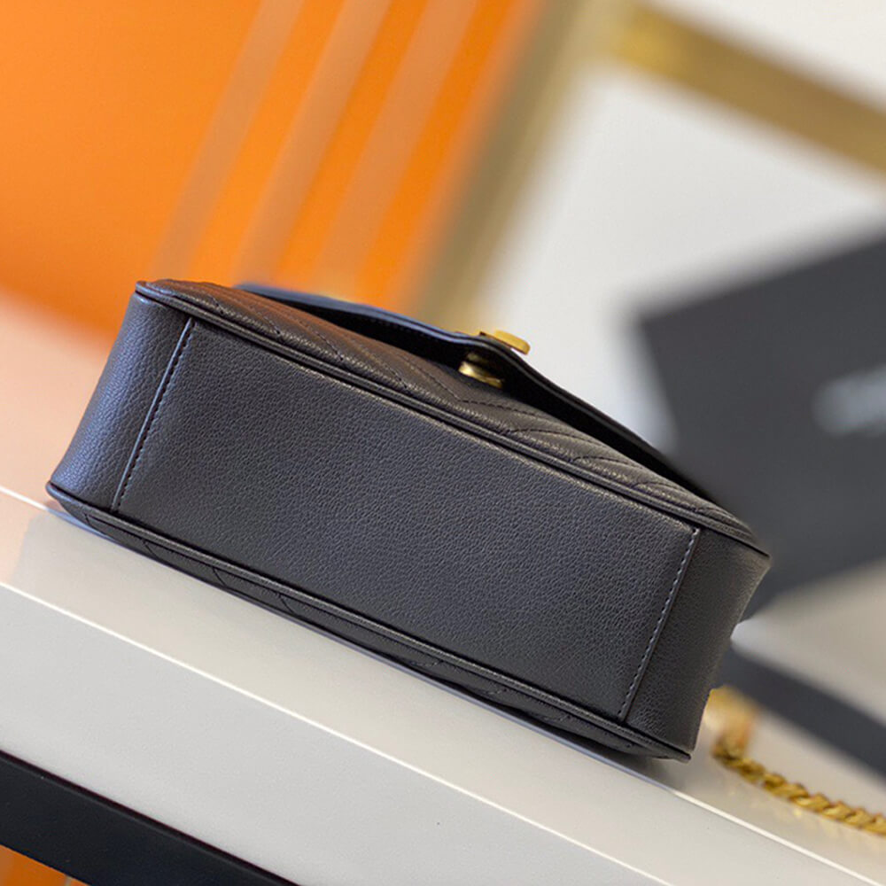 Antiqued-gold chain and black leather shoulder strap, black leather handle
