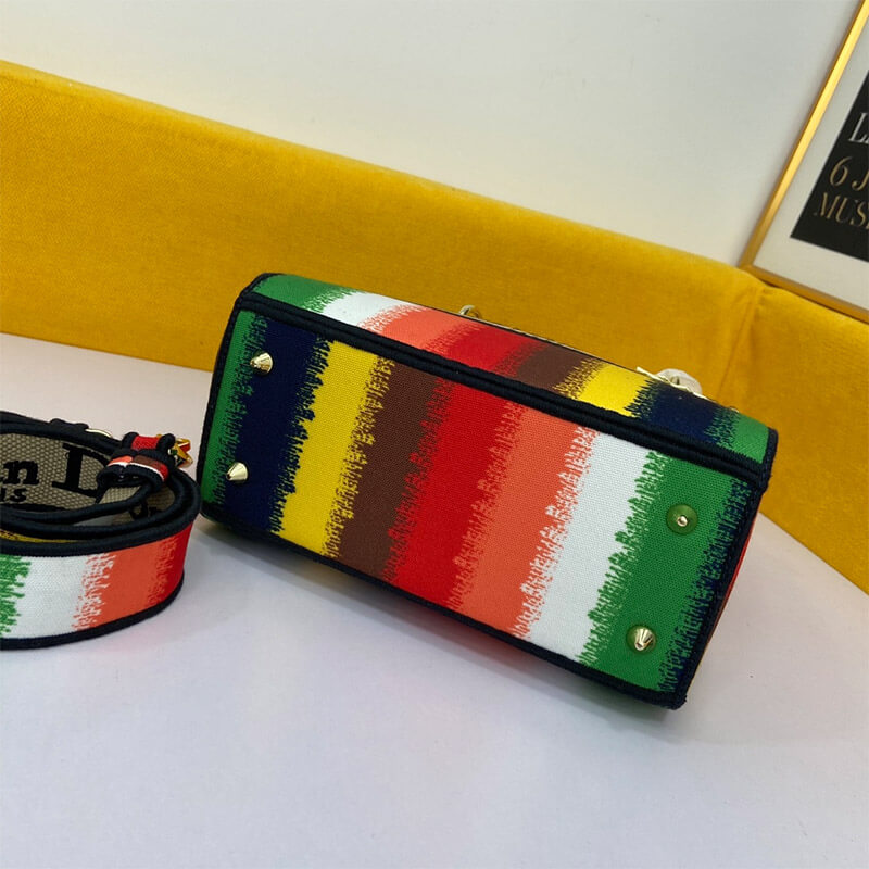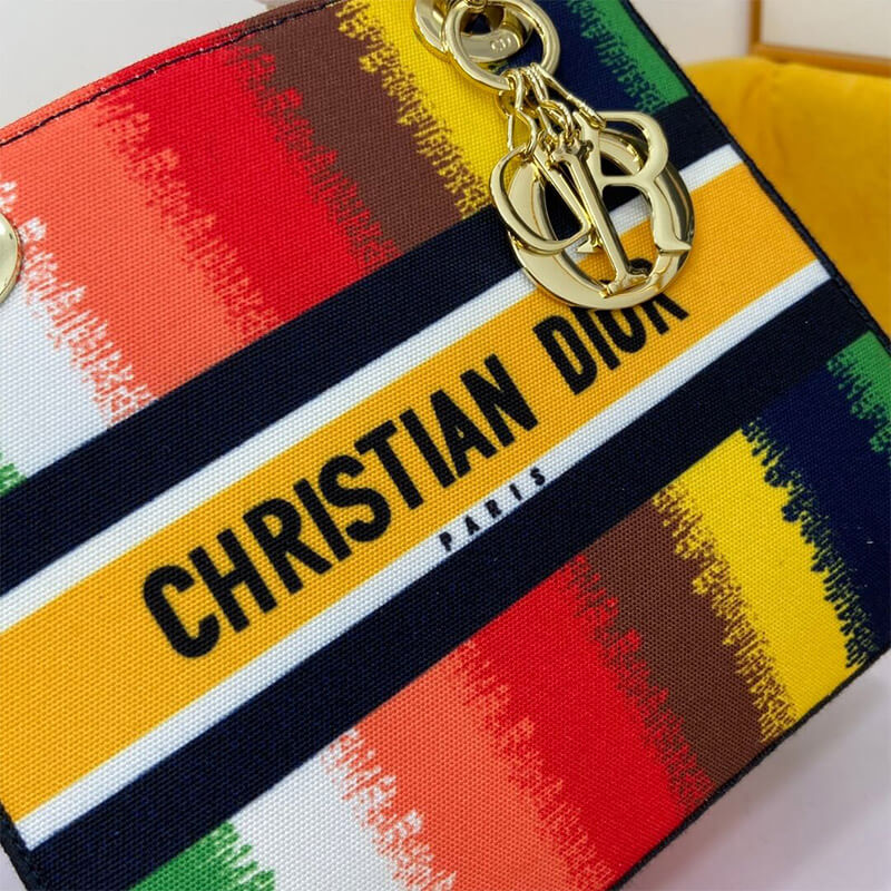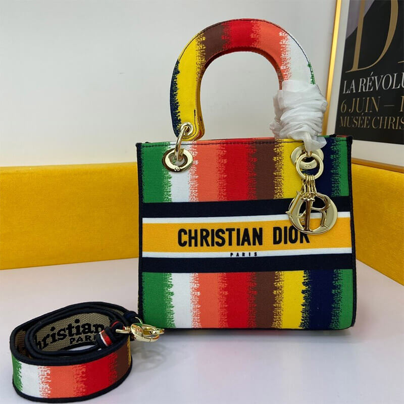 The Lady D-Lite handbag combines classic elegance with the modern feel of the brand. This style brings a new interpretation of the bayadere theme pattern this season. It is decorated with a full-scale multi-color mixed-color effect D-Stripes pattern embroidery, revealing a contemporary atmosphere, and the front is decorated with the ?Christian Dior? logo. The thick gold-tone metal ?D.I.O.R.? pendant is infused with pattern style. The medium-sized Lady D-Lite handbag has a wide, detachable double-sided embroidered shoulder strap, which can be carried, shouldered or slanted.